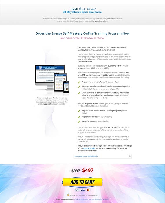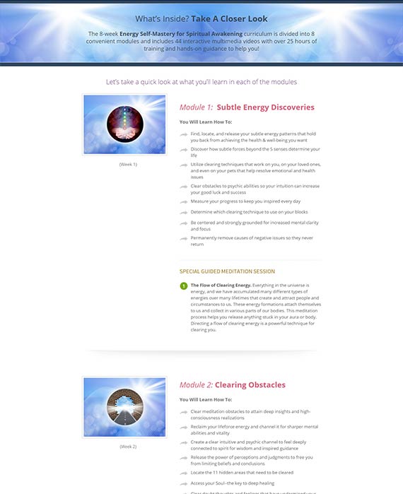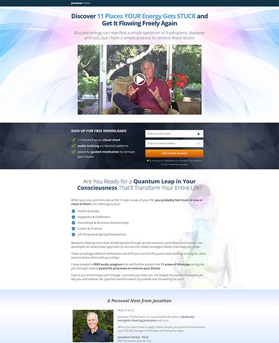 LANDING PAGE TYPES: OPT IN, SALES PAGE, ONE-TIME OFFER, CHECKOUT Energy Self Mastery is Jonathan Parker’s flagship personal development product. Every week a new module of this 8 module online course is released to members. The testimonials from those who have taken the course attest to its life changing nature. 01 Ontraport OptimizePress GoToWebinar 02 Sales Funnel Design Marketing Automation Webinar Setup Send paid traffic to high-converting landing pages for better message match and increased ROI.