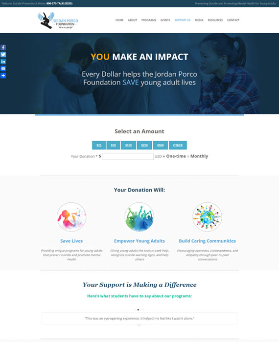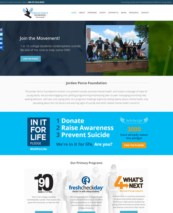 CLIENT: CHIMERA COMMUNICATIONS The Jordan Porco Foundation’s mission is to prevent suicide, promote mental health, and create a message of hope for young adults. They provide engaging and uplifting programming emphasizing peer-to-peer messaging promoting help seeking behavior, self-care, and coping skills. Their programs challenge stigma by talking openly about mental health, and educating about the risk factors and warning signs of suicide and other related mental health concerns. 01 WordPress Mailchimp Home Search App Events Calendar 02 Web Design UX / UI DESIGNJordan Porco Foundation