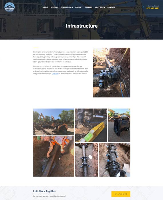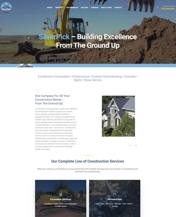 CLIENT: CHIMERA COMMUNICATIONS The SilverPick Contracting team has developed an excellent reputation as a premier environmentally-conscious builder of homes in Southwest Colorado. From excavation, infrastructure, curb and gutter, concrete pours, septic and utilities installation and repair, as well as snow plowing and removal, the SilverPick team has created a cadre of services to support the commercial and residential growth in the region. 01 WordPress Facebook Feed 02 Web DesignSilverPick Contracting