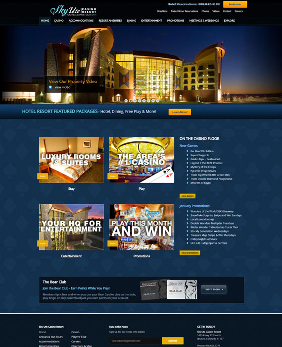 CLIENT: CHIMERA COMMUNICATIONS Sky Ute Casino Resort is Southwest Colorado’s entertainment headquarters. With a 140 room hotel and the hottest slots, poker, table games and bingo, this place is a four corners crowd pleaser. 01 WordPress Mailchimp Events Calendar 02 Web Design UX / UI DESIGN